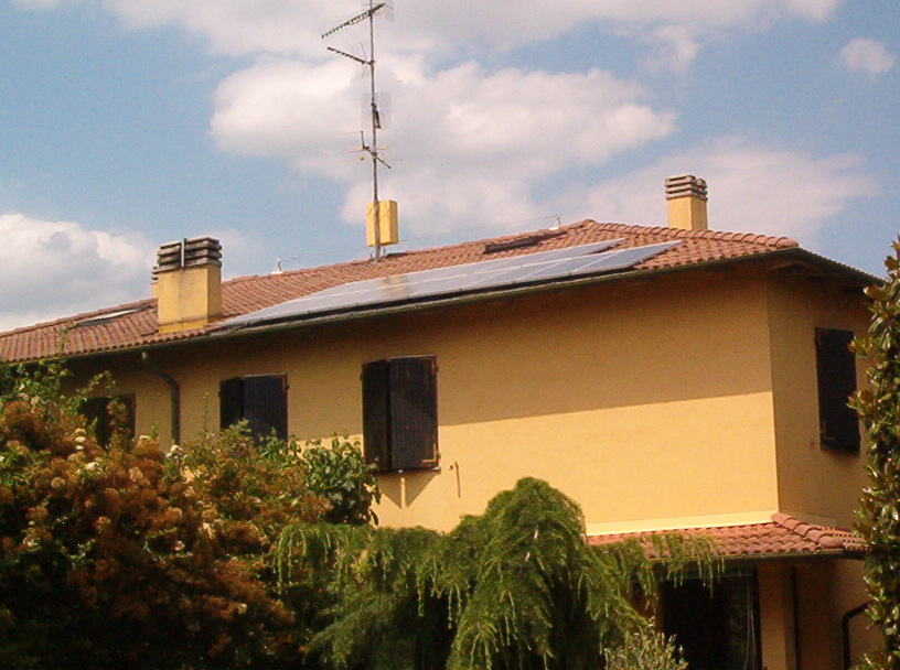 Immagine del primo impianto fotovoltaico privato realizzato a Castel San Pietro Terme in località Osteria Grande. L'impianto ha una potenza di 2,4 KWp e garantisce, grazie ad un inverter accordato alla rete ENEL, una produzione media annua di 2700 KWh che vanno a coprire il fabbisogno dell'alloggio sottostante